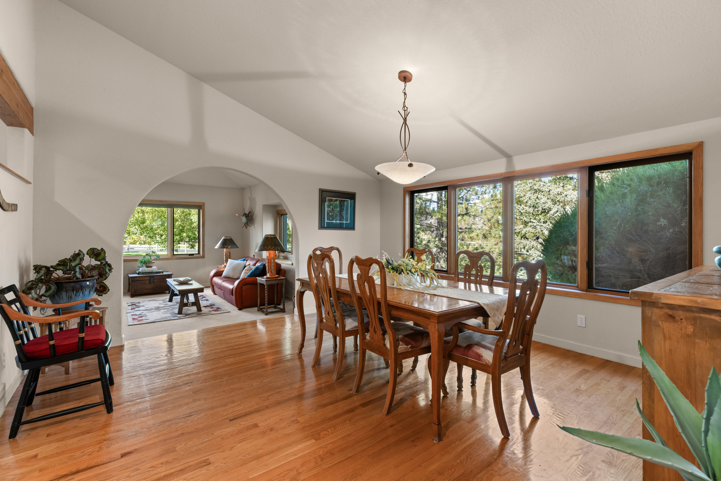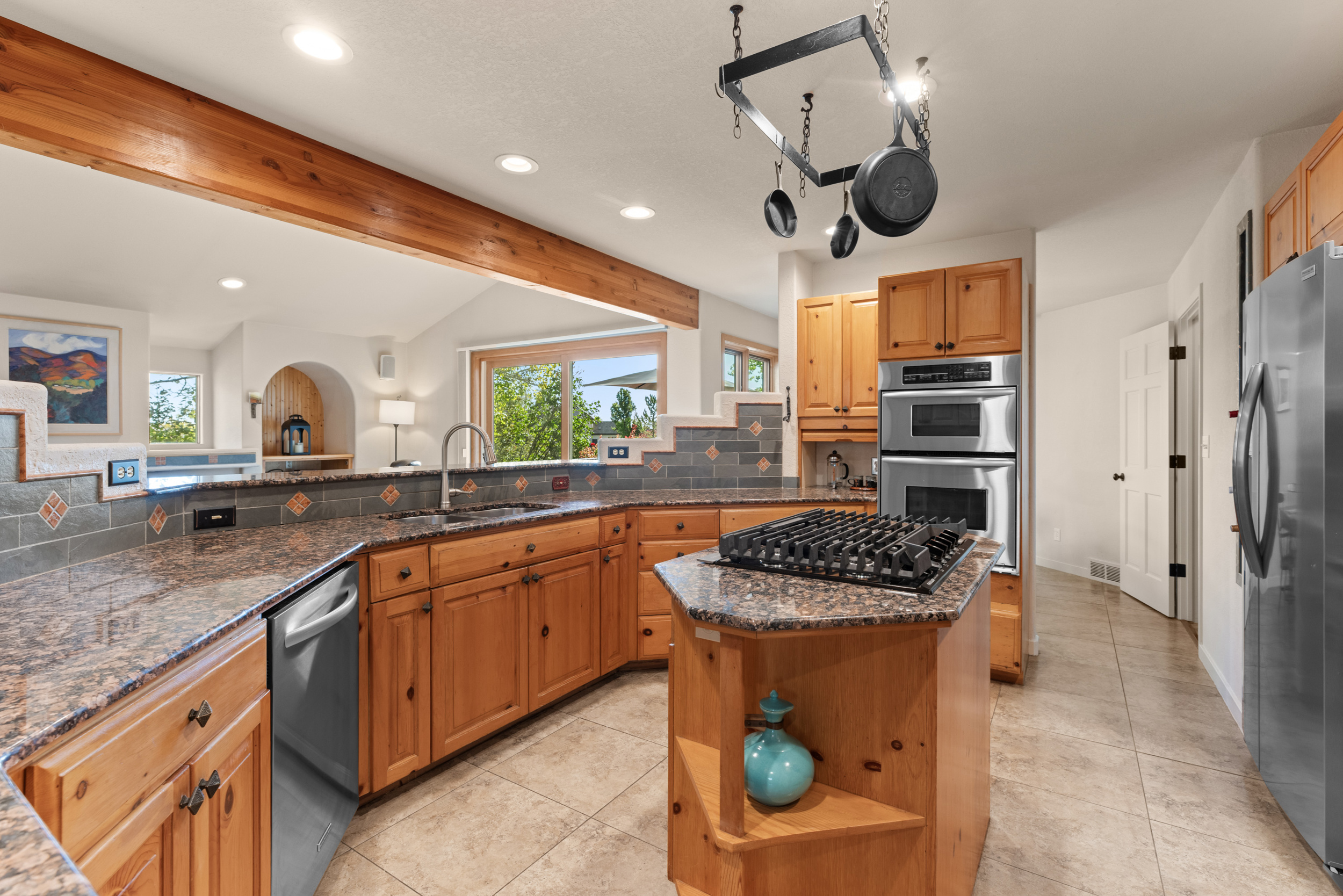 Imagine coming home to your own custom retreat set on two lush acres with a private yard, mature trees, and a six-bed organic garden bursting with vegetables and flowers. Outdoors, there's room for everyone to play, relax, and gather. Multiple spaces - including a horseshoe pit - make the expansive yard perfect for both recreation and entertaining. Gardeners and dog lovers alike will find this property a dream come true. Step inside through striking double doors and you're welcomed by warm Southwestern architecture. Designed with both comfort and entertaining in mind, the home's cozy layout connects a gourmet kitchen, living area, and wood-burning fireplace-an inviting space for family and friends. From here, two decks extend the living areas outdoors, offering peaceful spots to unwind in every season.